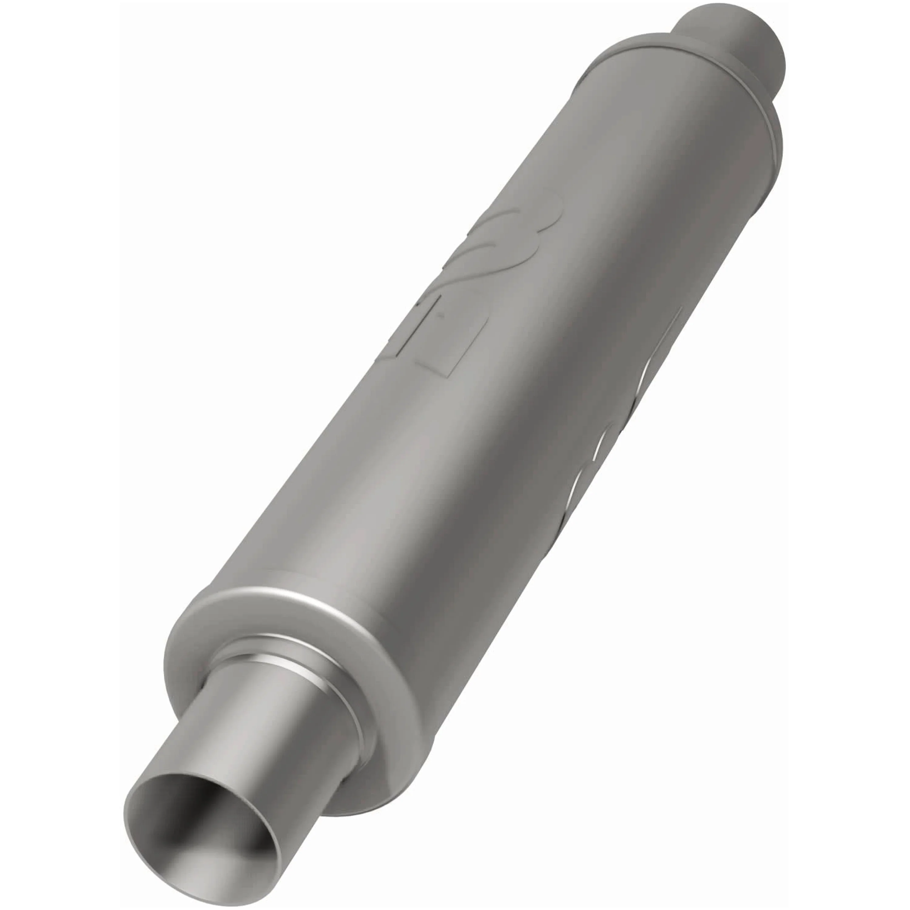 The MagnaFlow 4in. Round Straight-Through Performance Exhaust Muffler 10425 brings our world-famous exhaust sound and dyno-proven performance to your ride in a weight-optimized 4x4x18in. package with a premium satin finish. The straight-through free-flowing design of this round-bodied muffler's reversible, universal 2.25/2.25in. diameter inlet/outlet layout enables versatile installation options to match the spacing requirements of your vehicle. Due to the cutting and welding involved, professional installation is highly recommended. Internally, 10425 utilizes a perforated stainless steel core wrapped in stainless steel mesh and acoustic fiber fill to achieve a powerful, resonant tone. This muffler is made of durable, corrosion resistant stainless steel and produced using cutting-edge CNC precision robotic manufacturing techniques, all backed by MagnaFlow's limited lifetime construction warranty.