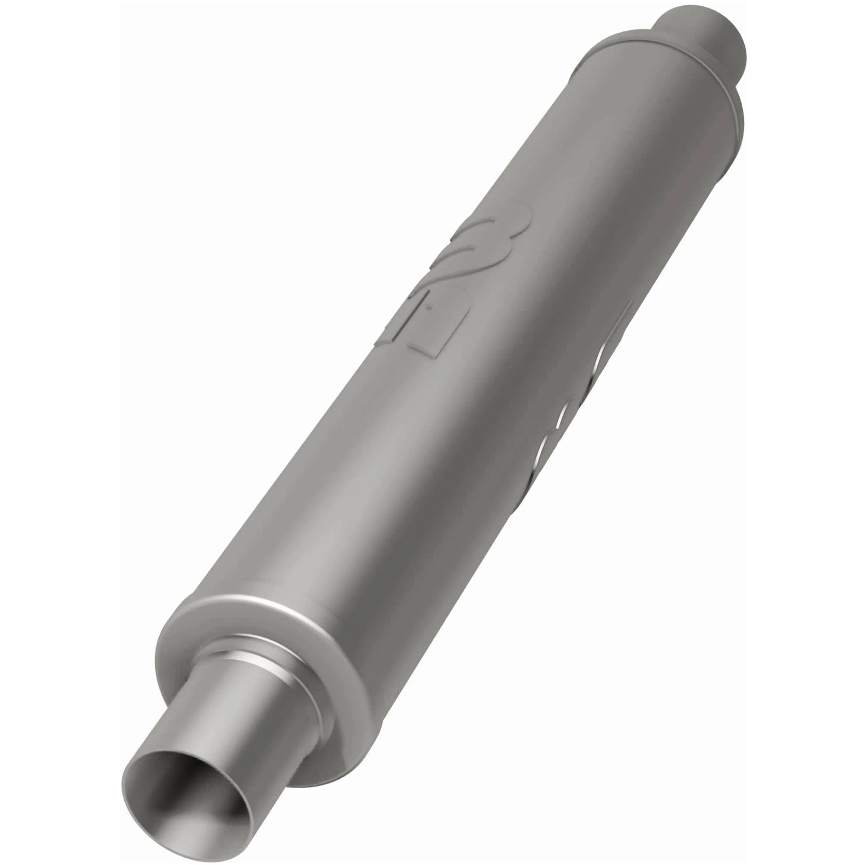 The MagnaFlow 4in. Round Straight-Through Performance Exhaust Muffler 10435 brings our world-famous exhaust sound and dyno-proven performance to your ride in a weight-optimized 4x4x22in. package with a premium satin finish. The straight-through free-flowing design of this round-bodied muffler's reversible, universal 2.25/2.25in. diameter inlet/outlet layout enables versatile installation options to match the spacing requirements of your vehicle. Due to the cutting and welding involved, professional installation is highly recommended. Internally, 10435 utilizes a perforated stainless steel core wrapped in stainless steel mesh and acoustic fiber fill to achieve a powerful, resonant tone. This muffler is made of durable, corrosion resistant stainless steel and produced using cutting-edge CNC precision robotic manufacturing techniques, all backed by MagnaFlow's limited lifetime construction warranty.