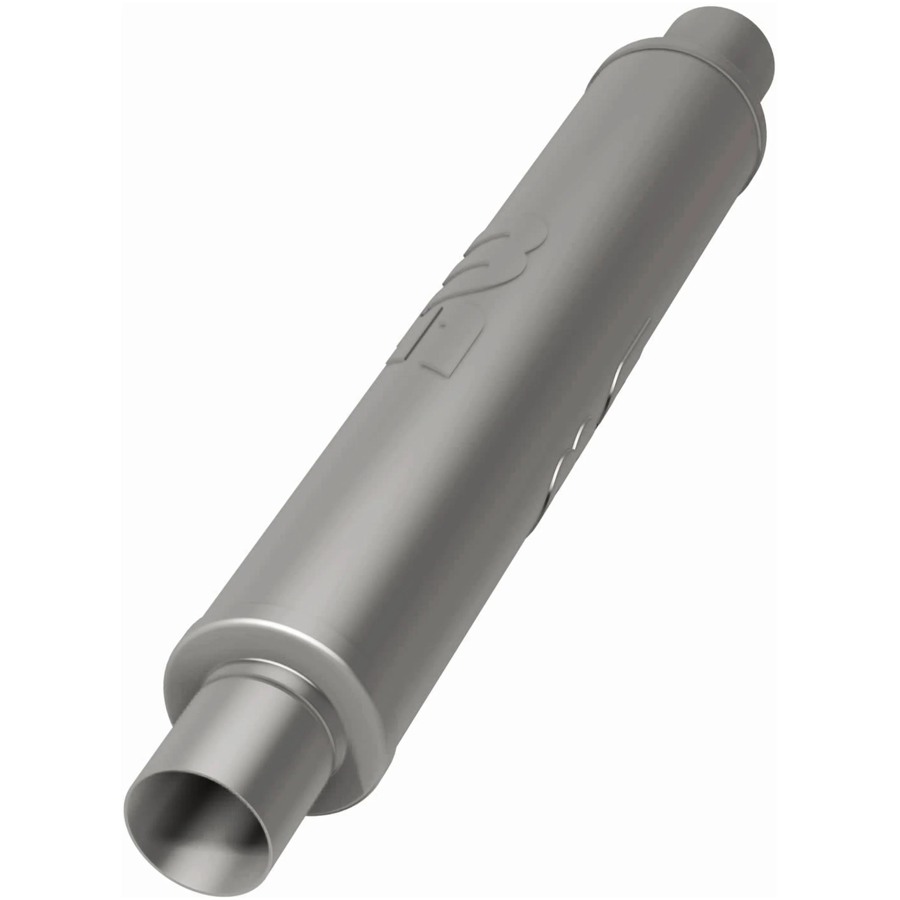The MagnaFlow 4in. Round Straight-Through Performance Exhaust Muffler 10436 brings our world-famous exhaust sound and dyno-proven performance to your ride in a weight-optimized 4x4x22in. package with a premium satin finish. The straight-through free-flowing design of this round-bodied muffler's reversible, universal 2.5/2.5in. diameter inlet/outlet layout enables versatile installation options to match the spacing requirements of your vehicle. Due to the cutting and welding involved, professional installation is highly recommended. Internally, 10436 utilizes a perforated stainless steel core wrapped in stainless steel mesh and acoustic fiber fill to achieve a powerful, resonant tone. This muffler is made of durable, corrosion resistant stainless steel and produced using cutting-edge CNC precision robotic manufacturing techniques, all backed by MagnaFlow's limited lifetime construction warranty.
