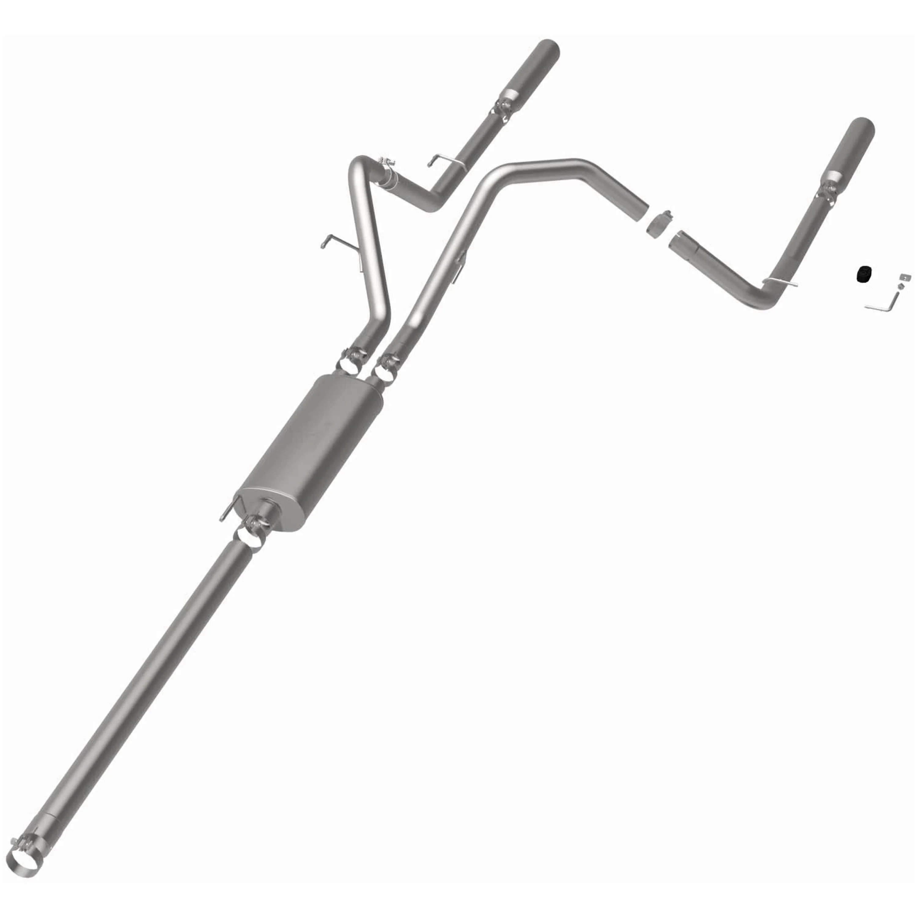 The MagnaFlow 2006-2007 Dodge Ram 1500 Street Series Cat-Back Performance Exhaust System brings out the personality of your 5.7L 2006-2007 Dodge Ram 1500 with our signature resonant, powerful engine tone and dyno-proven performance. Thanks to its fast-flowing, mandrel bent 3in. main piping and 1 Straight-Through mufflers ending in a Dual Split Rear exit with 3.5in. Polished Clamp-On Single Wall Angle Cut Rolled Edge tips, this Dodge Ram 1500 exhaust kit has the performance chops to match its sporty sound and appearance. Upgrade your ride to the next level with an exhaust that has the pipes to put other Dodge Ram 1500's to shame. With this system your vehicle will be producing Aggressive exterior and Moderate interior sound levels while leaving other cars and trucks feeling envious at every stoplight. Exhaust kit 16700 features a cat-back layout that replaces your ride's stock exhaust components from near the catalytic converter on back. Extensive 3D scanning during development has resulted in a direct-fit design that you can easily install yourself. 16700 is produced using CNC precision robotic manufacturing techniques and is backed by MagnaFlow's 1-year limited finish warranty and limited lifetime construction warranty.