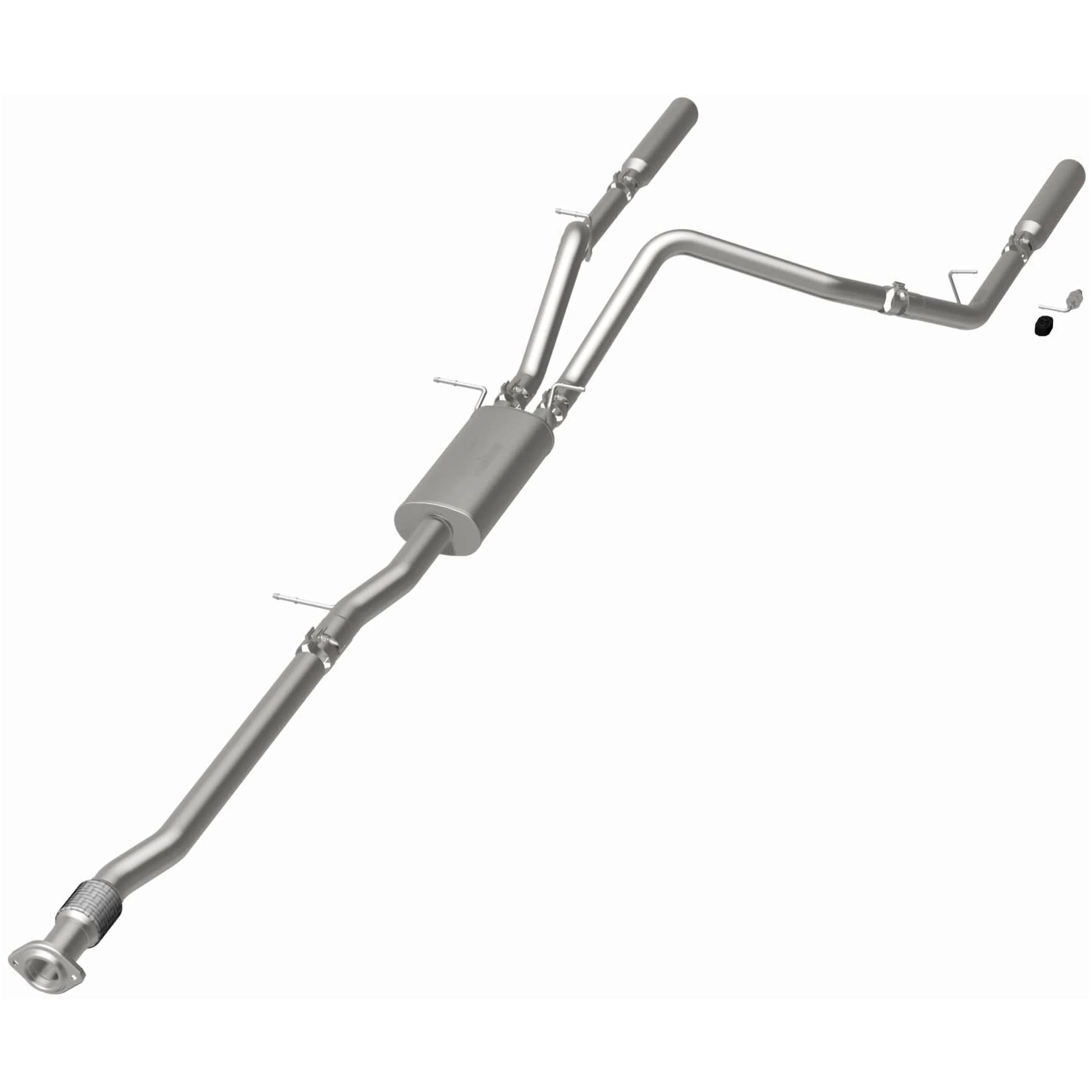 The MagnaFlow Street Series Cat-Back Performance Exhaust System 16741 brings out the personality of your Truck with our signature resonant, powerful engine tone and dyno-proven performance. Thanks to its fast-flowing, mandrel bent 3in. main piping and 1 Straight-Through mufflers ending in a Dual Split Rear exit with 3.5in. Polished Clamp-On Single Wall Angle Cut Rolled Edge tips, this Truck exhaust kit has the performance chops to match its sporty sound and appearance. Upgrade your ride to the next level with an exhaust that has the pipes to put other Truck's to shame. With this system your vehicle will be producing Aggressive exterior and Moderate interior sound levels while leaving other cars and trucks feeling envious at every stoplight. Exhaust kit 16741 features a cat-back layout that replaces your ride's stock exhaust components from near the catalytic converter on back. Extensive 3D scanning during development has resulted in a direct-fit design that you can easily install yourself. 16741 is produced using CNC precision robotic manufacturing techniques and is backed by MagnaFlow's 1-year limited finish warranty and limited lifetime construction warranty.