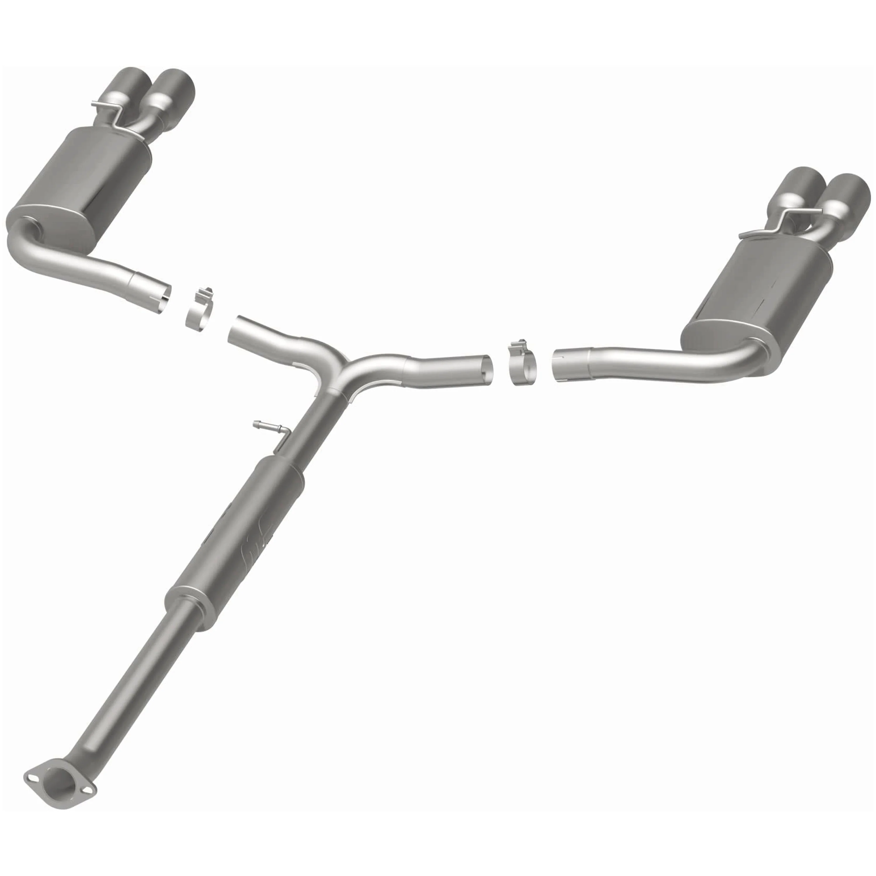 The MagnaFlow Street Series Cat-Back Performance Exhaust System 19457 brings out the personality of your Car with our signature resonant, powerful engine tone and dyno-proven performance. Thanks to its fast-flowing, mandrel bent 2.5in. main piping and 3 Straight-Through mufflers ending in a Quad Split Rear exit with 4in. Polished Welded-On Double Wall Angle Cut Folded Edge tips, this Car exhaust kit has the performance chops to match its sporty sound and appearance. Upgrade your ride to the next level with an exhaust that has the pipes to put other Car's to shame. With this system your vehicle will be producing Moderate exterior and Mild interior sound levels while leaving other cars and trucks feeling envious at every stoplight. Exhaust kit 19457 features a cat-back layout that replaces your ride's stock exhaust components from near the catalytic converter on back. Extensive 3D scanning during development has resulted in a direct-fit design that you can easily install yourself. 19457 is produced using CNC precision robotic manufacturing techniques and is backed by MagnaFlow's 1-year limited finish warranty and limited lifetime construction warranty.
