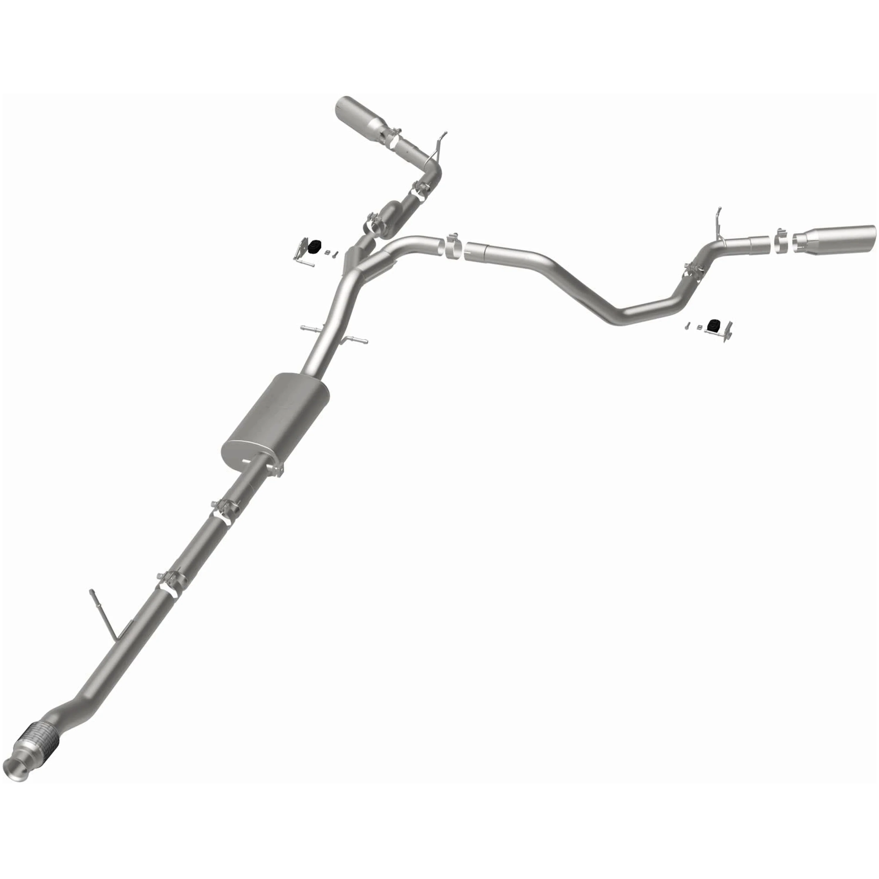 The MagnaFlow Street Series Cat-Back Performance Exhaust System 19473 brings out the personality of your Truck with our signature resonant, powerful engine tone and dyno-proven performance. Thanks to its fast-flowing, mandrel bent 3in. main piping and 1 Straight-Through mufflers ending in a Dual Split Rear Behind Rear Tires exit with 4in. Polished Clamp-On Double Wall Angle Cut Rolled Edge tips, this Truck exhaust kit has the performance chops to match its sporty sound and appearance. Upgrade your ride to the next level with an exhaust that has the pipes to put other Truck's to shame. With this system your vehicle will be producing Aggressive exterior and Moderate interior sound levels while leaving other cars and trucks feeling envious at every stoplight. Exhaust kit 19473 features a cat-back layout that replaces your ride's stock exhaust components from near the catalytic converter on back. Extensive 3D scanning during development has resulted in a direct-fit design that you can easily install yourself. 19473 is produced using CNC precision robotic manufacturing techniques and is backed by MagnaFlow's 1-year limited finish warranty and limited lifetime construction warranty.